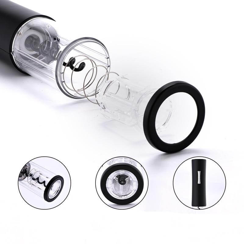 Onze elektrische wijnopener verwijdert de kurk in enkele seconden; deze wijnopener heeft een roestvrijstalen behuizing met een transparant omhulsel rond het kurkentrekkermechanisme, geen giswerk nodig; ingebouwde oplaadbare batterij, het verwijdert de kurk in enkele seconden en met de ingebouwde oplaadbare batterij kan het ongeveer 30 flessen wijn openen op een enkele lading.